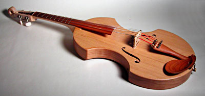 Spring 2007 Update This instrument is now fretted! For a couple of reasons, including just plain wanting to try it, I installed some low frets (modified mandolin fret-wire). It plays nicely to pitch though I have lost the ability to do strong vibrato. The instrument is tuned like a violin G,D,A,E, but a whole octave lower. It is currently strung with the three smallest strings from a 1/8 Cello set and a viola D string as the highest string. Lessons learned: The frets will destroy expensive silver-wound strings. I'm now using cello rosin to activate the lower strings a little more. In general the instrument is not as responsive (slight delay getting the strings to sound) as with smaller-gauge strings but has a nice, full low end resonance that I didn't get with viola strings. |