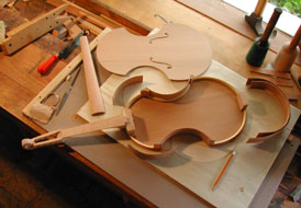 In this photo the sides (ribs) are in place and you can see the minimal back bracing and another no-no, a glued-in sound post. Broke a lot rules on this one. Actually, the construction process is more like that of a guitar than a violin. |