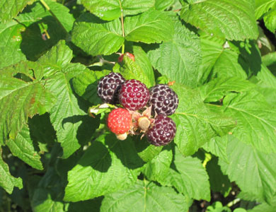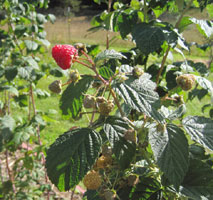 2022 - Good harvest, Aug. 18 last small picking, lots of SWD damage. Quite a bit stem borer issues, cut off tips when droop, burn. Letting Boyne and Killarney fill in between plums in central area. Smaller than in main (well mulched) bed but still fruiting. Both have good flavor. Killarney quite a good harvest. Transplanted one into main bed west, will let expand into Prelude spot. Killarney has better flavor. Prelude had decent crop in spite of poorish plants, used mainly for vinegar. Removed plants after harvest; planted buckwheat/oats. Latham - good in spit of some disease. Started last week July, good crop, good flavor. MacBlack - Very lush, vigorous, some disease but lots of berries. Pruned out some canes. Next year only leave 2 or 3. Shortened vigorous, thorney, canes. Great crop, first half August. Getting SWD later. Really like the flavor. 2021 - Mild winter, little snow, hot summer, dry spring - it wasn't the friendliest plant weather but some things liked it, and some didn't. The raspberries were mixed. Prelude was ripe early July and did fine. Latham had many dead canes, others sparse and slow to leaf. It may be a disease issue. I'll give them another year. I missed the fruit. Mac-Black raspberries didn't do well. The older canes and laterals all winter killed, though the new growth looked good. I missed that fruit, too! I know it's on the edge here zone-wise but I'm still holding out hope. Will see how they do next year. The Pequot Black Raspberry leafed out before everything else, all tips winterkilled. Put out some small partial fruit, foliage rough. Cut down and dug out later. In May I "planted" Wood Bluet Mushroom spore in the mixed mulch bed I made last fall along the north side of the raspberries. I found a few fruits so am hoping for a harvest next year (see Mushroom page). 2019 - Another hard winter, even for the usually hardy raspberries. Prelude lost many canes but there were enough left for a decent crop. They are the earliest to ripen, starting July 17 this year, lasting a couple of weeks. They aren't as sweet as Latham but they are appreciated as they are. Since SWD (see below) are still around in good number the harvest was sporadic, especially toward the end. I did as I have the last years, pick every ripe (or close to ripe) berry every day, eat the good ones, toss the mushy ones (into a bucket of water for a few days). I appreciate the Hummingbirds (and anything else that might be making a meal of the SWD), plant more flowers they might like, and try not to get too upset about it. They're here, and we're here, and we're all eating raspberries, though our share is less right now. I expect it will balance out. The Latham also had some winterkilled canes but did well overall. They start as Preludes are ending but the SWD did a pretty good job on them this year so harvest was sparse. They are worth the trouble to get what I can though being a very tasty raspberry. I finally accepted that Nova just doesn't like it here, or the canes I bought came with their own issues. I think it might be the latter given the high regards others have for this variety. But I dug them all out and planted a few of the volunteer seedlings that were growing all over the garden (thanks to tossing buckets of SWD infested berries onto the compost pile the last few years). The mint also found a new home here. The old plot had gotten quite full of unwanted perennials so it was time to start afresh. The end of the raspberry plot seemed a good option, especially since there was that empty spot where the Nova had been. No spot in the garden stays empty for long. There are also new Boyne and Killarney growing in the nearby orchard. They are looking good and I hope to have berries in a few years from them. I have grown both before, and like them. Being in the less "civilized" orchard environment instead of the cushy garden plot they will probably be a bit slower to grow but they are both sturdy, hardy varieties. The big surprise, a very pleasant one, was the black raspberry I had planted last year. Here is my report on the day I ate the first one, August 4...