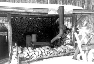 in the corner of the shed and wood is stacked around it. When sap season comes