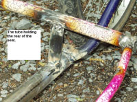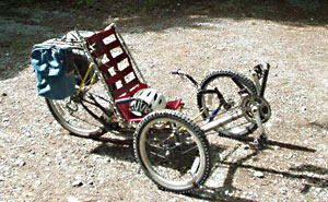 Way back in September of 2003 Handley wrote: "I built this bike for less than $50. I had a few old bikes (free from the dump) and some other parts given to me. The main tube is muffler pipe with no bends. The biggest expenses were for ball joints originally meant for the throttle linkage of trucks that I bought from NAPA and used for the under-seat steering. Also 2 new chains from Walmart. I was able to borrow a pipe bender to bend the electrical conduit for the seat. The web of the seat is made from old car seatbelts. I have ridden it several hundred miles and it is comfortable and stable. The only bad part is that since the tube is straight, the seat is a couple of inches too high off the ground and that makes it a bit awkward to get on in the first place, but once underway, it is no problem. The straight pipe does make it very easy to build. The welding was done with a flux core wire feed arc welder. The chain runs in plastic tubes to keep grease off my pants. This is a second effort. The first has a long wheelbase and is lower. The seat is not comfortable for rides of longer than 10 miles or so though, as it has less back support. I have not ridden my regular bike since building the recumbents. As you can see, I am a believer in under seat steering. Comfortable to ride, easy to get on, knees have room to move, and when you fall off ( yep, it happens to me too ), there is nothing to get tangled up in. By the way, I am an old phart, age 61." June, 2006 Update Handley has been busy and has come up with a nice looking tadpole trike!