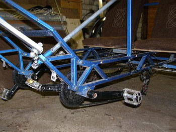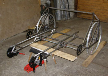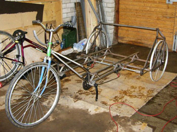 trike like this for years. Check out the drive train! Here is what Koit had to say about this cool trike. "Here's my recumbent tandem. What's maybe different from lots of others is that it has a so called center shaft which riders are pedaling and from what are the rear wheels are powered. In that case one or two riders power both rear wheels equally so bike doesn't want to turn if one pedals harder than other plus riders can choose different gears in witch they choose to drive, so they are independent from each other. The second thing is the rear triangle is opposite to conventional bicycle - in that way I managed to shrink down the bikes overall length by half meter. The frame is made so it can be taken apart from pedals if you look closely - the idea was I could bolt on rig with a "standard connection" and I could hook it behind a car like a trailer, but I had some legal problems with it. Steering is made with linkages and rod end bearings. It has 28" wheels." Here are some more photos of the frame during construction. |