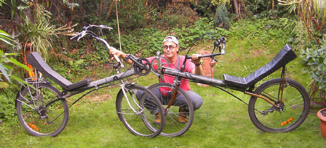 "This is a pair of recumbents I made for my bike buddy (that's him on