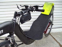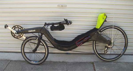 John Reynoldson's Homebuilt Carbon Fiber, Short-Wheelbase Recumbent - 3/2008As you can see from the photos below, John Reynoldson has done a really nice job of putting together his Talon Carbon Fiber, Short-wheelbase recumbent. Check out Recumbent Bike section of his web site to get an idea what is involved in the construction of this type of bike.