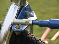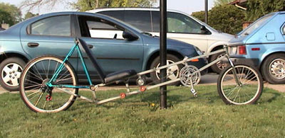 The two photos above are of Mark's first homebuilt recumbent, now (2005) three years old. Nice shot of his front fork modification for under-seat steering.