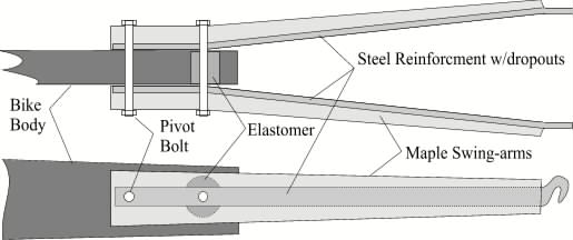 Construction details for TreeBikes rear triangle. Well, here finally is a better (hopefully) description of how the rear 'suspension' of TreeBike was put together. As you can see, I cut off and squashed the original rear triangle way down - hardly a triangle at all now. (The three vertical pieces in the picture are non-structural (rear rack))