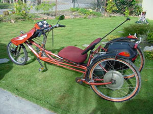 some of his other creative projects to promote simple, green living. This is what Timmothy had to say about his "...dual power assisted Electric tricycle from outgrown bicycle and houshold parts." "This is my lean dual powered tricycle, made of parts available at home right from used computer chair to a salvaged kid's outgrown bicycle. "It is designed with a choice of 3 power modes,human, combination of human & Electric power and ful Electrical, all can be individually selected to suit personal preference. 1.Manual mode:Pedal cycling for muscles toning up & burning of waste colestrol! (2 motors switched off). 2.Electric assisted mode: For light exer-cycling & climbing hills or low speed cruising (1 motor switch on ). 3.Full Electric power for high speed riding at 24 km/hr! (both motors switched on). This Tricycle is equiped with Amp meter,Volt meter and protected by a resettable 15Amp NFB(no fuse breaker that also acts as a switch). The Amp & Volt meter shows current battery condition and available power. "A solar panel can be built into the fairing to charge the 3 units 12 volts,7AH Computer UPS gel battery! while parked in the daylight as an upgrade modification. Sorry Im unable to attached the free plans & detail progress photos as it was all destroyed through a flood that hit my place in 2006!"