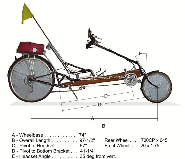 Of course many other measurements can be taken from a printed copy of this page. Just print the page from your browser, grab a ruler and protractor and write down the direct measurements from the printout. For example, I measured the steering tube length as 48 mm. and the Wheelbase (A) as 111 mm. Since we know that the Wheelbase is really 74" we calculate the steering tube length to really be 32".
