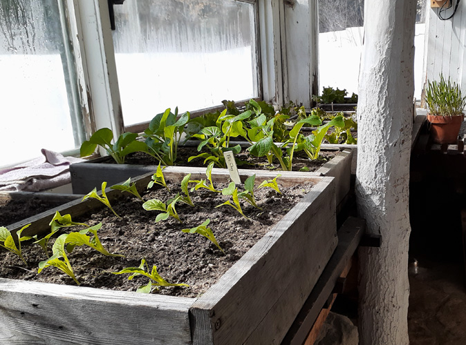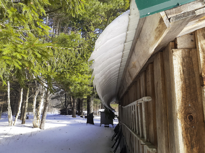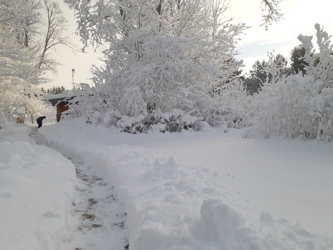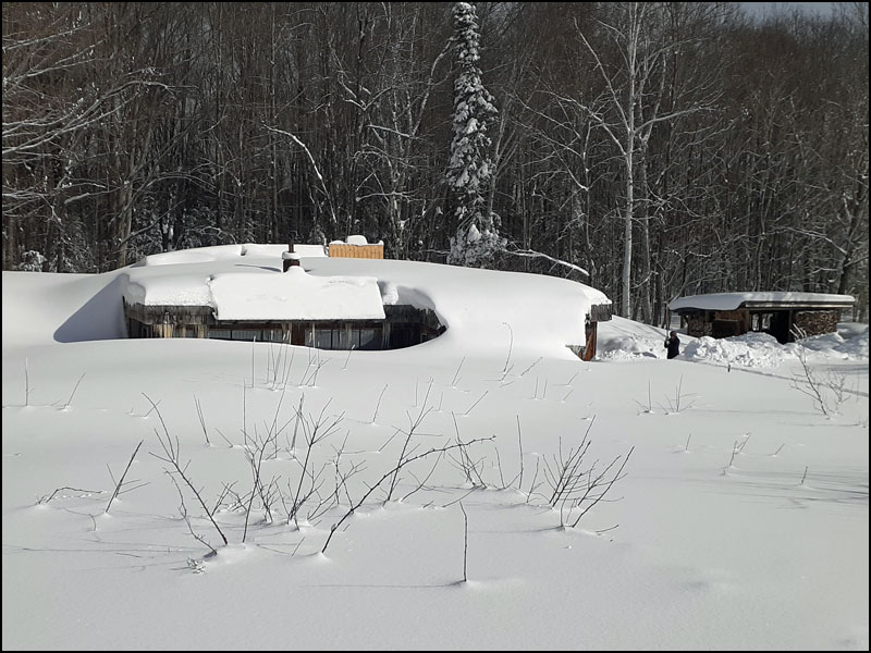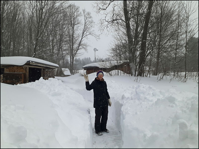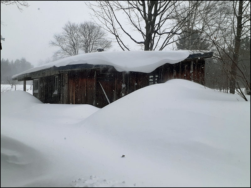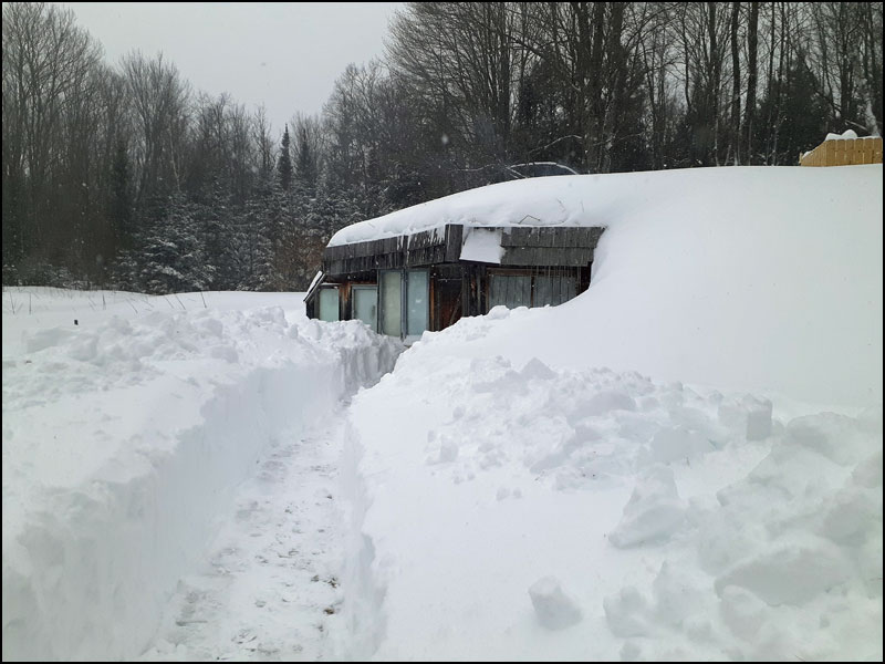 And the star of the greenhouse may not be an edible (to us) but it is greatly appreciated for its happy and welcoming greeting as one walks in -- the beautiful, reliable Alyssum. A small sideshoot dug up from the garden in the fall, quietly and slowly growing through the minimum light of winter, then suddenly (it seems) it expands into a large, beautiful plant, holding court from its rightful corner of the bed. In the garden or the greenhouse Alyssums for me are an amazing, hardy, dependable companion. April 1, 2026 Gonna hike March 17, 2026 -- The storm is over and the Official Numbers are In -- This was indeed a record snowfall! And it did indeed keep snowing. But now it is over (this one anyway!). It's hard to say how much snow we got when there are a rare few spots of just 8" to likely nearly 5 feet in the largest drifts. But out on the flats I measured 40" on the ground. A respectable amount for a UP blizzard (this storm was on top of the one just 3 days earlier which gave us nearly a foot of snow - a storm now eclipsed by this larger blizzard). It made for fair amount of quite energetic digging to get the snow up over the banks. But today we got the paths shoveled to the shop and outhouses, and made space for the gate to the garden/orchard to open (no, I'm not planning on starting the garden yet! But our solar panels are inside that area and we keep them free of snow). It was a beautiful day with sun and clouds and no snow falling (well, a little bit later in the day - winter isn't over yet). And so incredibly beautiful everywhere you looked. Next we strapped on the snowshoes and broke trail up to the garage where we found our wonderfully kind neighbor plowing out our garage! The big road plow had been down for a brief run (one lane). Basically the UP is still shut down - lots of of roads to get plowed by our incredible and probably quite tired road crews. So we cleaned off the car (our old garage isn't exactly weatherproof in a high wind blizzard like this one), cleaned up the edges of snow when Ken was done with his plowing, chatted with him, then snowshoed back home on the now re-established path. Finished up by uncovering the greenhouse and solar heating panels, and the clerestories on top of the house (and it sure was nice to go inside and have all that natural light back in the house!). So it's almost back to winter-normal on the homestead now - not counting the big snow banks and drifts out there. But we well remember our first decades here when 3 feet of snow on the ground and super high drifts along the roads was common. The fun just never ends here in the North! March 16, 2026 Finally in the afternoon - a lull, and possibly winding down of, in this much-forecasted-anticipated true UP-March-Blizzard. A few days ago it seemed a bit too much of hype but it hasn't stopped snowing and blowing since early yesterday morning so guess they were right. Especially since the snow seldom just "fell" - it's been either racing horizontally or engaging in wild swirls and tornadoes. But there was this brighter, calmer period so we opened the door -- not bad, less than a foot of snow. Well, right against the door that is! The high winds had made an incredibly rich beautiful swirl of scrapes and drifts and patterns that outshone any human-made artwork. So we decided it was time to get out of the house, and more importantly, get a path made to the woodshed. So Steve started digging at the door (where it quickly went from "not much" to "VERY much") while I put on my reliable snowshoes to walk to the woodshed and start digging at that end. So I stepped out in the space Steve had just carved and -- mmm, now what -- how does one get from down here to UpThere? (by a rather very inelegant clumsy step-lunge-jump (on snowshoes mind you) (and Steve's laughter didn't help). OK, even I admit, this is quite a bit of snow, it's a true big storm, even for a diehard Yooper who loves winter. And we rather enjoyed it, tossing snow up and out until we met in the middle of the path, right in-line. We soon filled up the inside wood-box (first tossing out sunflower seeds in the woodshed for the mob of chick-a-dees who amazingly appeared the moment we first opened the front door!). Mission accomplished we headed back in to warm up and admire the ever changing landscape as the wind and snow began to ramp back up. The rest of the shoveling could wait until the storm was really over. We wondered how much more it would snow, and decided It would be really OK with us if it stopped snowing right now. Really, this was enough. But first, the requisite photos... March 1, 2026 I'm going to take each day It's winter! It started early and continues - with rain and sleet, snow and wind, ice and sun, calm occasionally, changing often, but always beautiful and interesting. Each year is so different and this one is no exception! Schools have been closed often for all of those conditions, but we're cozy and content here, inside a lot but out and about most days. Here is a photo of the hangar outbuilding working to move some of that heavy snow off its roof during the most recent melt.