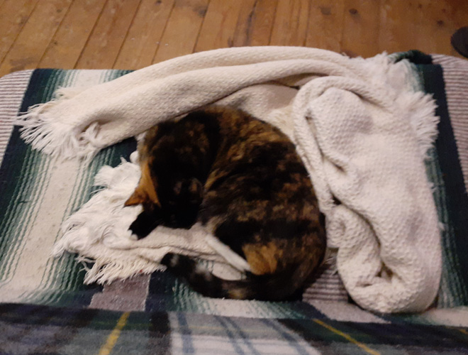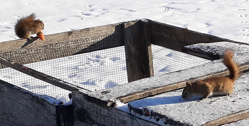 April 2, 2026 -- April Cheers Bring.... well, a Mixture March ended and April began here with a few welcome beautiful mostly-sunny days and temps mostly above freezing. The Melt begins (again))! Nice and slow and gentle. It will be awhile before the snow is gone but we're already seeing bits and pieces of bare ground, the snow depth is decreasing, and odds and ends re-emerging. Nature has been kind to us as winter continues by giving us a few calm nice days between the bouts of "active weather". Now today we're in the midst of a mixed precipitation storm (wind, snow, sleet, rain, ice, etc) and we're hoping for minimal ice acumulation. But we can imagine spring -- we heard the first Cranes a few days ago and the first adventurous Junco arrived, scratching about those small patches of bare ground to get the first over-wintered seeds. The first bird gets to eat! And we're quite happy to have plenty of indoor projects to keep us busy, cozy and content out of the weather. It's another natural pruning/thinning event for the trees and I know all those bits and pieces of bark and branches scattered across the snow will help the melt when the sun shine again.