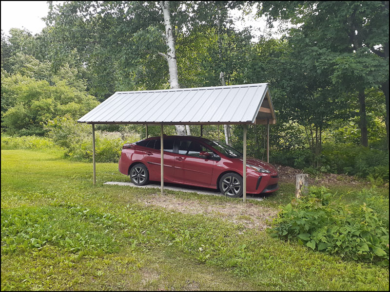 Over the years we have made several 'carports' out by the shop to protect the cars from the sun, falling limbs and birds but none were designed to last and the most recent was recycled a few years ago. I saw an opportunity to re-purpose a few of the pieces of well drop-pipe from our recent well upgrade so surplus well pipe became carport roof support posts. All of the wood was from homestead stock; maple and cherry for the main support beams and rough-sawn basswood 2x4's and more cherry for the five trusses. The roofing metal and a few U-bolts to hold the roof down were the only purchased materials. You can see some 'in progress' photos here. It was a fun 2-week project! In spite of rather a wet spring Steve managed to cut hay for mulch for the garden. And it dried nicely on those in-between dry days. So the hay stack has begun growing, as he rakes and hauls. This is a welcome sight for me! I'm getting getting caught up on weeding and soon will be moving hay to keep those pesky weeds from regrowing. They are loving this weather! But so are the garden crops. It's an enthusiastic growing machine out there. Happy Summer!!