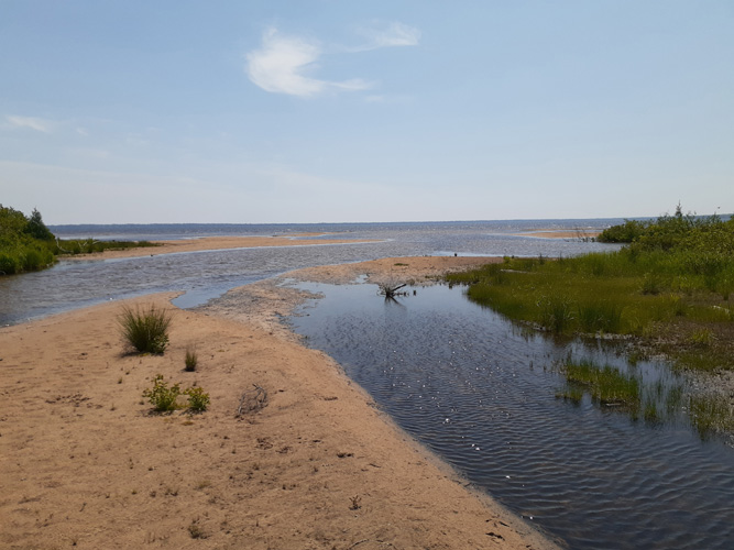 It had scoured the shoreline flat and smooth, a very wide area far out into the water. The waves were breaking far from shore with shallow sheets of long flat water gently moving up the now very wide beach (snow covered in the photos), receding, as another comes in. To get into water above knee level one would have had to go out a long way (we didn't check that out). The distance varied as we went along the curve of the beach but it felt like we were walking on a wide ocean beach (well, except for the temperature, snow and cold breeze!). No ledge just long flat expanse. I reminded me of areas with large tides and wide mudflats. Almost all of the plants and roots and stems were gone, the sand was peppered with scattered small stones in one area, zebra mussel shells in another. But almost no driftwood, just a few random pieces. We walked to where the shoreline starts getting protection as it curves out into the water at Stoney Point. There was still an area of vegetation here before it transitioned to stone. We turned and walked back, in the sand (except when a more ambitious sheet of water came farther up to meet the snow) and at the edge of the frozen, snow covered beach. It was all bare sand yesterday when Steve saw it. Quite a sight. It's a guess as to what will happen as winter, waves, wind, ice and more storms arrive, what will change, what will it be like come summer. It was a delightful and interesting hour's walk. Though a bit chilled we warmed up in the car and decided to head into Manistique to see how the Boardwalk had fared. Here we found a similar situation as at the Rogers Park beach. The waves (which were larger here) were breaking farther out, with a wide expanse of flat sand, stone, or shale beach showing. We hadn't seen that much 'beach' since the low water levels about 10 years ago. Since the Boardwalk (combination of pavement and wood) was mostly covered with a mix of sand, snow and older frozen snow/slush our steps were some more deliberate but it was a good walk. The sun went down and the clouds cleared enough to give a beautiful if brief sunset behind the waves breaking against the breakwater out to the lighthouse. We made it back to the car before dark having had another hour's enjoyable walk. We decided to finish off our "Solstice Walks" warming up with dinner at a nearby restaurant. AuTrain Beach on Lake Superior 2021 This is by far our favorite beach anywhere.