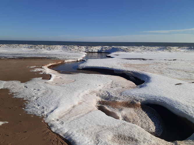 patches of bare wet sand that turned into snow-free bea At Rogers Park the run-off "creek" from the flowing well at the Park was being dammed up before cutting its way through the ice to join the Lake, making a picturesque scene in the rather sparse landscape. There was a narrow driftwood bridge over the far narrows to help us across without incident. An animal had walked across the nearer safe-looking natural bridge, but what you see is not always what you get as Steve found out on a previous walk. These "bridges" are often undercut by the water and can be very tender. At another run-off creek farther along the beach Steve's snowy bridge collapsed and he ended up knee high in very cold water! But today's walk was without major or minor incident and we returned to the car as the sun headed toward the trees and the temperature was falling, appreciating this rare sunny day.