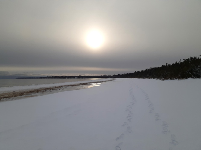 We decided to walk on past the Park and the old dock area to Thompson Creek. The snow-melt has swelled the Creek already and it was running full into the Bay, with Lake waves noisily breaking near land at the small harbor beside the mouth of the Creek. The sound and sight of lively free-running water was wonderful. Depending on how much snow we get (it IS still only mid-March) it is possible it won't be long before there will be a snow-free stretch all along the beach. There is still significant ice/snow and ice-mounds out into the Lake but even that is starting to break down. The transition from winter to spring is such an interesting time, even before the first signs of green appear. February 25, 2022 -- Flat Snow Beach As we drove south from our snowshoe at Pine Marten Pathway towards home the sky cleared and the sun shone brightly. Since it had been a fairly short walk at Pine Marten it was still early so we decided to go on down to Thompson and go for a walk on the beach in the sun. We again don our snowshoes for easier walking but this time in snow maybe only 3-4" deep. As has been the case, the scene here was again different. The latest snow had made a beautiful flat fresh landscape of the beach. It was a treat to just walk along without breaking trail through the deep snow at Pine Marten. What a contrast between the two! Feathery clouds were making their way in across the blue sky, and off to the east it was dark. Somewhere out there it was snowing. But here was bright, warm in the sun and cool in the breeze (with an occasional strong gust to make us stop and pull our coats tighter). We hadn't been the first to enjoy the beach though.