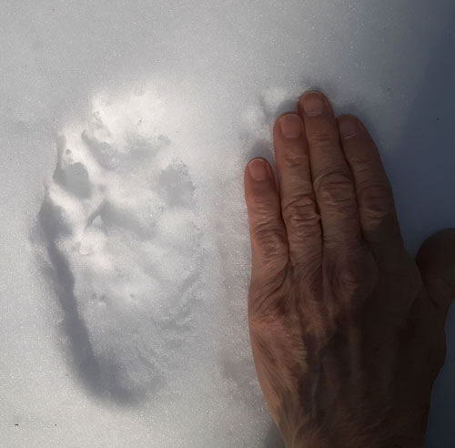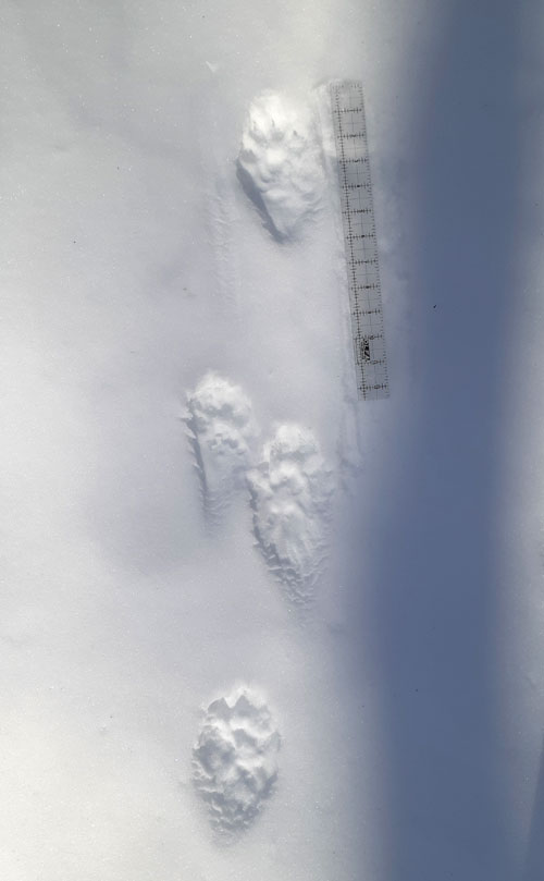 March 12, 2023 -- Tracks! We love seeing the many different animal tracks in the snow here on the homestead -- fox, coyote, neighbor's cat, squirrel, mouse, grouse, chickadees... They are all a delight. But there is one set of tracks that definitely makes us stop and take notice: The photos were taken a few days after the prints were fresh but they still showed clear enough though in soft snow. They went along the western part of our property. It's not the first time we've seen wolf tracks but usually there are two sets, one smaller than the other. This time it was just a lone track. We weren't too surprised to have wolf since we seem to have a pretty good population of hares (based on tracks), their main food source. LilliB wasn't as excited as we were to have a wolf on the property (understandable), being very reluctant to go outside for a few days. But then she reacts the same way when the neighbor's beautiful big black cat (male) pays a visit. So we never know the reasons but we trust her judgment. March 13, 2021 -- Around the Block, plus It was a great forecast - sunny, high of 52 degrees. Wow! We'd walk the block, maybe take a lunch, go a little farther to find a spot to sit and bask in the sun. The roads would be clear of snow, maybe a bit muddy in spots but it should be good walking and we could leave the boots at the garage and continue on in shoes. It might be a strange pleasure but it's a real one. Well, it was indeed beautifully sunny and it made it up to 40 before we headed out (46 when we got home, according to the thermometer, the one not out in the wind). Maybe we didn't really expect 50's yet, but 40's was nice! The wind amped up a few knots to make sure we didn't expect to be out in shirt sleeves. It was strong enough that as we left the protection of the woods and headed down the road face into it we quickly amended our plan to possible just down the road and back. But we adjusted layers, covered ears and heads more thoroughly, and decided to just keep going. It was a SW wind but after 2 miles when we turned onto the west road there would be a fair amount of woods to give us a break. The sun shone and we walked on bare ground for three hours (except for that part from house to garage -- still plenty of snow in our valley), and enjoyed the hike. We had occasional breaks from the wind thanks to trees or houses and walked on down Advent Road for an additional mile, as far as that road is plowed, then back. More traffic than usual, being Saturday and a nice day, so we waved at a number of passing cars and talked to the usual array of cattle. There had been a brief lull in the wind, much appreciated, and we found out why as we headed north. Wind change. Now that was unfair! What was supposed to be "wind at our backs" the second half was again wind in our face. Ah well, lots of woods on this road. Around the corner to the east and a bit chilly along those wind-swept pastures. In spite of it not being warm-warm, it was still warmer and we were both a full layer lighter in clothing than we had been all winter. As we turned for the final north leg home the wind picked up to gale force, at least it felt like it. No ways about it -- it howled. It was a good thing it was in the 40's and not the 20's. Hats and hoods tightened we hunkered down and walked the last half mile into the wind, heads down, looking up occasionally to make sure we didn't run into anything (not that there was anything to run into). It was a relief to get to the garage and the protection of woods. Even more so as we headed down off the hill into our own woods, wind-tension and noise eased, warmth returned, nice to be home. It was a great walk, even counting the wind, over 8 miles and the first almost warm one of the year. We know there will be more. March 12, 2021 -- Disappearing Paths