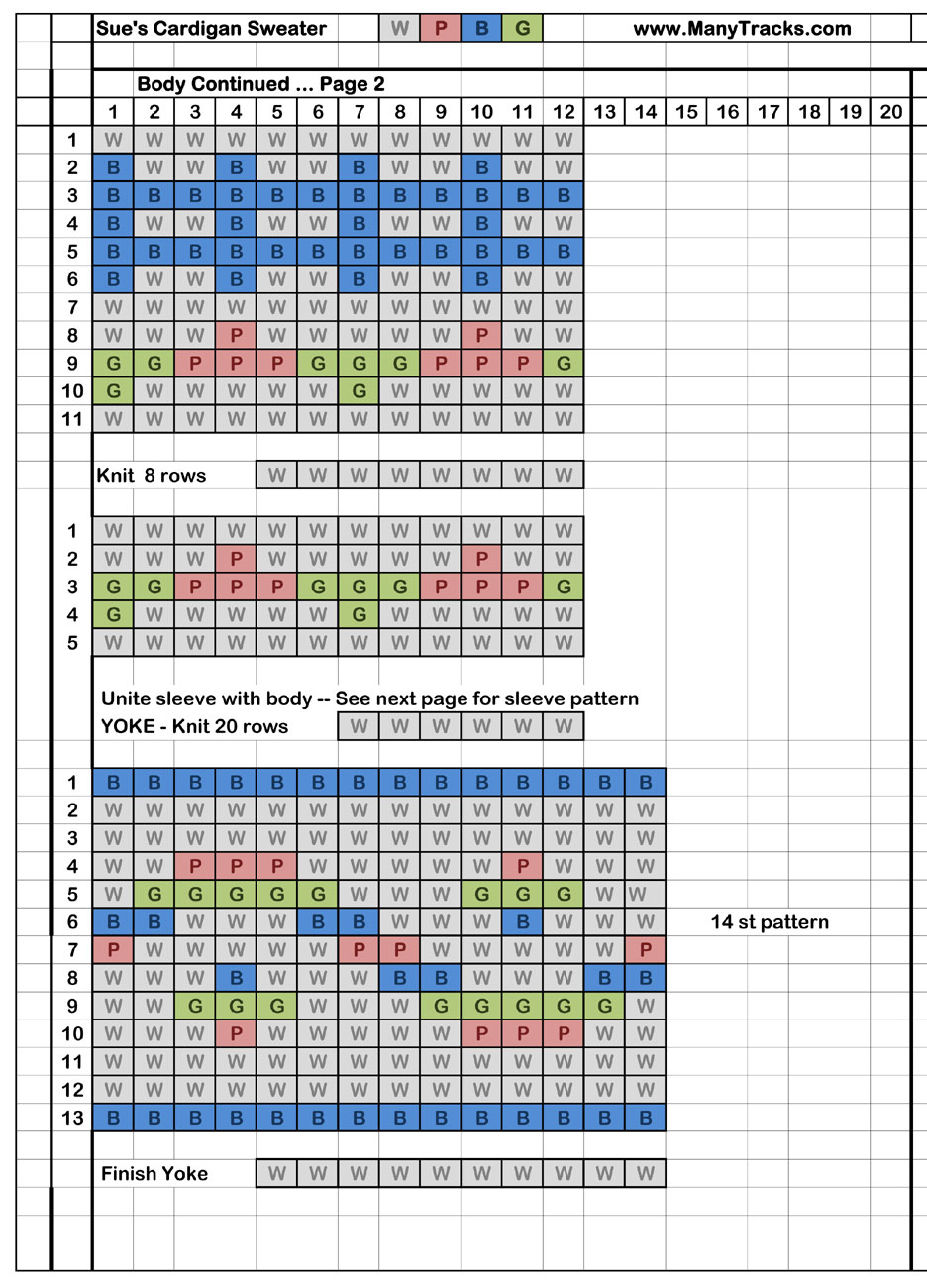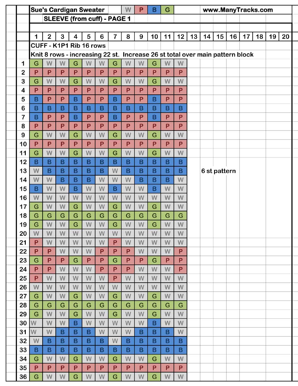 PATTERN DESIGN CHARTS -- Click on the thumbnail (small photo) to download an image of my design pattern used for the sweater - two pages for the body and two pages for the redone sleeve (see photo above). Use your back button to return to this page. This isn't a complete "how to knit the sweater" document, just the chart for the design, shared for your own use and inspiration in creating your own designs.
