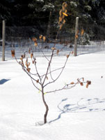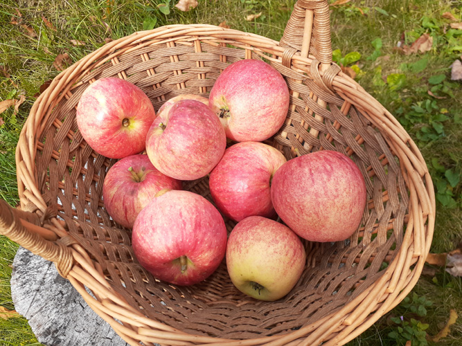 Purchased from Fedco in 2013 on standard Antonovka rootstock, as a fall ripening apple with unknown parentage. They report it as a "superb tasting dessert apple, juicy, distinctly tart full flavored ... keeps for about a month ... very good early season cider". Sounded good to me. They give it a zone rating of 4-5 which is a little worrisome but I decided to give it a try anyway. Leaves are late to go dormant and fall (as are some others - Black Oxford, Starkey, Smokehouse). 2025 - #1 - Very little pruning this year. Light 12 apple crop, three dropped Sept.21, 22, so I picked the rest. Nice apples! Lots of flavor, enjoyed every one. 2024 - #1 main tree (with Carroll) - Did fine this year. Small crop of 8 apples. First fruit dropped 9/10. Four days later realized birds were enjoying the fruit by tasting almost every one! Picked all but two (picked week later picked). Flavor just OK -- think picked too early, and damage didn't help. 9/22 more flavor, good eating. But by first Oct. those left were getting mealy. Next year I'll cover fruit with tule bags early on and let them ripen more on tree. #2 - Because of the possible issues (see 2023 below) with the main tree I cut scions late winter to graft elsewhere. Decided I had plenty of Starkey's (two own trees plus a fairly large part of BeaconS) so grafted 4 Canadian Strawberry scions onto one of the smaller Starkey's (C), which decided to come through with a nice crop of a dozen good apples in spite of its youth. So I didn't cut off the Starkey originals yet; I'll wait till the CanSB grafts grow more. 2023 - Tree growing nicely with moderate new growth. And finally (after ten years) - blossoms!! 27 of them. Carefully watched ten apples (3# 13oz) grow. 10/6 two dropped so picked other 8. Background color nice pink/yellow, beautiful smooth medium-large fruit. Nice sweet with flavor, good sweet-tart balance, nice medium juice and tender-firm texture. Very nice apple! Easy eating. Good timing between late summer apples (Beacon, Dudley, Goodland) and late storage (Haralson, Black Oxford). Goes to top tier of delicious apples for us, with Goodland, Discovery, Seek-no-Further. We enjoyed eating the apples through October. Last one 10/27 was still flavorful but on the edge of mealy, possibly one of the first drops. Likely should pick these a as soon as they appear ripe and don't wait for them to drop. The deep wound on trunk is disconcerting but it doesn't appear to be diseased and tree is growing around it (though not closing over yet). Unfortunately, there is also a crack in the trunk where the west lowest (fairly large) limb attaches (apparently poorly). Need to keep an eye on that. Consider next spring if there is a way to reinforce there. Marked to cut a scion to graft elsewhere 'just in case'. Am a little concerned about the hardiness of this tree but hopeful the Carroll grafted on top will help pull it through any hard winter. This challenging hot-dry summer didn't appear to bother it. I want to keep this tree going! 2022 - No bloom yet. Healthy enough, decent growth, looks fine. Noticed fairly large healing wound on trunk where branch had been cut off earlier. Carroll also doing OK. 2021 - Grafted another Carroll to even out the top. Tree did fine, even had a few blossoms. Carroll grafts look good. Interesting that in the fall the Carroll grafts dropped their leaves with most other apples, Canadian Strawberry tree didn't, as usual (along with Black Oxford and a few others). 2020 - Mid April pruned off 2 lowest branches. Good year, healthy, moderate growth. Carroll grafts on leader growing fine (2018-19). 2019 - Good year, healthy, moderate growth. Grafted two more Carrolls just below last year's; one died. 2018 - Grew well, vigorous 9-19" growth. Looking good. Didn’t drop leaves though cold fall. Grafted hardy Carroll onto top leader to hopefully help hardiness. Graft grew 6". 2017 - Tied down lower side branch to more horizontal. Pruned off one of two centers. Looking good, nice moderate growth. Didn’t drop leaves in fall (once again). Plan to graft something hardy to top of center leader. Concerned about continued hardiness/dormancy. 2016 - Doing better, more growth. Keep main "new trunk" branch dominant (tied to lower branch to more upright position--worked well). Prune off bottom branch next year, too large diameter. 2015 - Doing fine but slow growth. Chose one of the surviving branches and tied it more upright, pruned the others back, removing one. 2014 - Hard winter. Died back to snow line over winter. Several limbs below 2 ft snow survived. let grow. I need to pay more attention to those zone ratings! 2013 - Purchased from Fedco on standard Antonovka rootstock, as a fall ripening apple with unknown parentage. They report it as a "supurb tasting dessert apple, juicy distinctly tart full flavored ... very good early season cider". Sounded good to me. They give it a zone rating of 4-5 which is a little worrisome but I decided to give it a try anyway. That first year the leaves had some scab, blight and rust. Two large caterpillars devoured most of the leaves before I noticed them. But the tree regrew leaves and finished the season OK. |