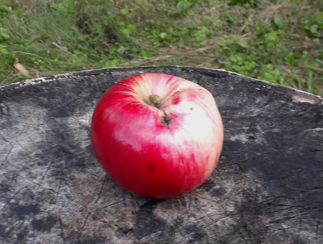Grafted with scion from USDA-NPGS in Geneva, 2018. Hardy variety bred in Manitoba, and not readily available here in the States. It got high marks for fresh eating flavor. Since my Canadian Strawberry was of somewhat marginal hardiness here I decided to graft this likely hardier variety onto the top with the idea it would help the CanSB go dormant earlier and help hardiness. Also put a graft on multi-variety a7 crab ne area. 2025 - #1 - First apples (two) on grafts on CanSB tree! Photo of largest one above, a nice somewhat squatty round apple. It dropped 8/22. I tried it right away but it, unfortunately, wasn't quite ripe, the seeds only partly brown. The texture was nicely tender and though it was a bit not-yet-ripe tart it was eatable with an interesting flavor touch. The second, smaller, apple came off 9/1 when I attempted to put a tulle bag on it (to discourage bird bites). The Carroll part (top) of the tree is doing fine. 2024 - #1 - Grafts on CanSB doing fine, decent growth, somewhat whippy branches with few spurs, no bloom yet. #2 - To my surprise the still short, north-side shoot grafted on the a7 crab (main varieties Prairie Spy and Akero) had a bloom and set a first fruit! It dropped 8/23 - soft smooth color, tender smooth texture (maybe over-ripe), interesting nice flavor, easy eating, sort of Mac-like. 2022 - #1 - Grafts on CanSB doing fine, growing nicely, no bloom yet (nor on CSB). #2 - on a7, graft slow, short. 2021 - grafted another ne branch. Older grafts doing well. End November. Carroll leaves dropped but CanSB (once again) didn't. Don't know if it is really an indication of dormancy (Black Oxford also is late to drop leaves) (as is Starkey on BeaconS). 2020 - Central '18 graft vigorous, healthy. '19 so graft growing well, too (east one died? No notes, hard to see graft line). Next year graft another scion on w and ne sides. 2019 - 3/18 center of last years graft almost girdled by ?. Buds near base good so cut off top ~6" to regraft nearby in May so & e. Grew well. Original grew fine also in spite of damage. Graft nearby branches in future. Maybe from a7. 2018 - [1] grafted to leader tip of Canadian Strawberry to be top half of tree; hoping will help hardiness. Grew well then found something ate half around bark below growth! Don’t know what. But continued OK with 6" growth. [2] Also grafted to small north branch on a7 wild crab in east orchard, north (with 4 other grafts). 1/2" tip growth +bud/
