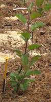 See Dudley page for information on the mother tree. 2024 - Back to growing vigorously, healthy, nice branching. 2023 - Some nice growth, no sign of fireblight though we had some in the main orchard this year. About 7 feet tall now. 2022 - Recovering nicely, some decent growth. No sign of FB. 2021 - I had thought to remove the seedling but decided to leave it and see if it recovers, looking somewhat better. I pruned off what I could of damaged parts including the central leader. 2020 - Hit with fireblight, badly damaged but alive (mother tree Dudley in main orchard no fireblight). Bad FB year. 2019 - Growing vigorously, healthy. 2018 - Selected best; transplanted to rough NorthEast Orchard in fall (where all trees will be allowed to grow full size). 2017 - Six grew, healthy. 2016 - Sept. 29 planted several Dudley core chunks in nursery.