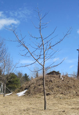2014 - No blossoms, looking good. 2013 - No blossoms, good shaped central leader tree. 2012 - 5/30 freeze killed all fruit blossoms. 2011 - One apple! Did OK, some leaf curling (dry year?). Apple dropped 9/28. Nice large size, rather tart but good flavor, good texture. 2010 - From Fedco. Planted 4/7. Good strong large sapling. Several blossoms! (removed). Some leaf curl but did OK. Copyright © Susan Robishaw |