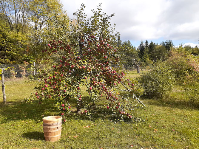 10/29 I decided it would be best to pick the rest of the fruit, leaving just a few for the birds. To my surprise much of the fruit had continued to grow and there were a decent number of nice medium sized apples. I stored two dozen to see how they compare to the earlier harvested crop. Dumped a full 5 gal bucket in the woods for the deer and squirrels. Quite a harvest from this moderately sized tree, especially considering the challenges of the hot and dry spring/summer. Mid November I started making sauce from mix of Haralson and Black Oxford - so good! The combination of juicy Haralsons and dryer but sweeter (at this time) BlOx's make a great sauce. Haralsons are sweetening but not at their best really until into December and later when they come into their own and we really appreciate their delicious fresh flavor. First of March sorted the last 50# of Haralsons. Tossed only about 6# smallest or wrinkled. Half others (about 20#) nice, fairly firm, a bit less flavor now but still good eating. Other half decent but getting wrinkled and a bit rubbery so made and canned sauce. Root cellar in upper 30's-40's. Mild winter so warmer than usual storage. April 16 ate the last Haralson - still good! Next year I need to save out more for longer fresh eating. 2022 - Pruned off top tier, ~10", lowering tree to ladder height (~12 ft). Minor other pruning; looks good. Moderate bloom, in scattered zones - south high full, low none - other patches here and there. Had some blossom/tip blight (as many other trees did) - kept pulled off. Noticed a "rough" dark spot on bark. Don't know cause but kept sprayed with ferm. comfrey/spinach (as did all trees with any issues). Looks healthy otherwise. Did some thinning of fruit. First ripe apple dropped Sept. 29, beautiful, large, brown seeds, tart but some sweet. Had two late 20's frosts. Decided to pick. Very zonal fruit set. Overall a beautiful crop, most med & large, only a few scab or cork, some bird pecked (~ peck). Picked 2 hb, 37#, good fruit. Pretty good for a "light" year. Store for sauce and fresh eating. End Dec. sorted ~ 1/3 soft or damaged made sauce. Some sign of bitter pit rot. Eat rest fresh. Some wrinkled in Jan. but still good eating. As before they sweetened in storage, very good in December. 2021 - Year Off The Haralson picked a good year for an off year, with another end of May freeze with the apples in full bloom which meant very little fruit. The tree continues healthy, needing just general light pruning. Plus I took the top tier off to get it down to my new ladder height (about 12 ft). 2020 - Big Harvest Light pruning, thinned out thicker east side. Bloomed vigorously and set vigorously. I thinned the end of June - turns out I should have thinned more. Tree to tall for new ladder - need to bring down next year pruning. End Aug dropping underripe, full size apples, some bug damaged. 9/12 dropping ripe apples, picking up for sauce. Tree is over-loaded w/ fruit I think. 9/17 freeze forecast (was 24 deg at camera, 28 w/in tree) so harvested bottom half of tree. Mostly medium size, look OK -- 3 1/2 hb! 9/25 birds (or one bluejay!) eating, mostly the very good large ones, so picked top half of tree. Look good. Total harvest 132#! ~3 1/2 bushels. Later in storage