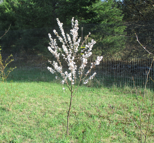 More closely related to plums than true cherries. Hardy z2-7, height 7-15’. Highly adaptable, early bloom builds up pollinator population for other plants. (gf) I’m fond of the fruit; it’s on the small size and pit is a little large but they are tasty. A little tart but sweet enough, very juicy, and prolific. To keep as shrub thriving keep replacing older stems with new ones - 6-8 good healthy stems. Great variability in fruit quality in seedlings. 2023 - Full bloom on the largest plant (#2) May 10, followed a few days later with the next largest (#1) ~3/4 full. Couple others had some blooms, too. These were the first orchard bushes to bloom and #2 was FULL of pollinators. Nice to have something early for them, and later some fruit that I don't mind if the birds eat. 2022 - May 15 two largest plants blooming. Had two nights 20's freeze the 23, 24th. But did get some fruit. Snacked on them now and then. Rather large pit but nice flavor. Range of sizes of the five bushes; likely partly due to varied soil conditions but also because they are seedlings. 2021 - Sparse notes. Only have the five (best) plants inside fence. I assume others died over the past few years. They didn't get much attention and were quite small to begin with, likely should have stayed in nursery bed longer. But two of the five have grown nicely with some blossoms. Two others OK but not as robust. One on far east row still quite small, soil likely not as good. They are scattered through orchard. Don't know if they have need to be closer for pollination.2020 - Lost one Nanking over winter but rest doing fine, large plants had some blossoms. May 29 a 25 degree freeze with cherry bloom just starting. A record long hot summer. Some yellowing of leaves but not major. 2019 - A few blossoms on couple of the bushes inside fence. Pruning to one stem/trunk in order to cage against voles. 2018 - Bought 10 seedling plants of mixed small sizes early May from Soil Conservation tree sale. Planted 5 best in orchard, 2 next best outside (1 died mid summer). 3 smallest in nursery (small sticks w/ minimal roots); grew well. Mid Oct. transplanted 1 outside by sw gate, 2 to NE Orchard.Online Notes: