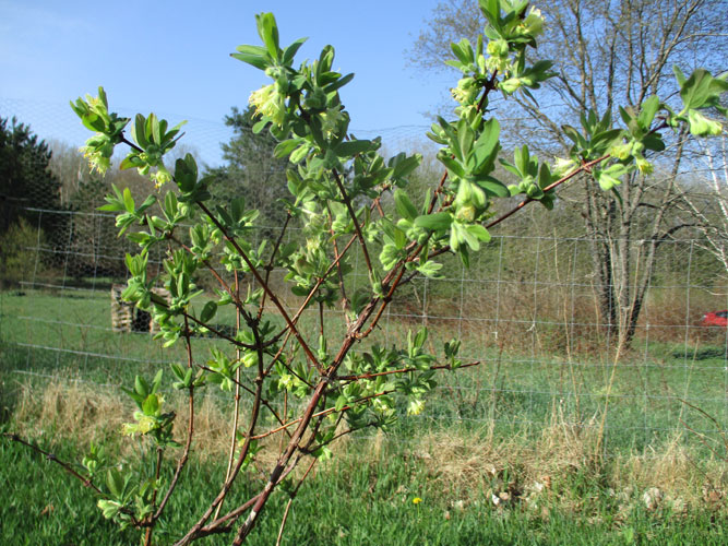 2020 - We were involved in major house repair/renovation work this summer so the orchard in general and the Haskaps in particular got minimal attention, which didn't seem to bother them at all. All plants grew well, recovering from previous vole and heavy snow damage. There was fruit which mostly got left to the critters. Maybe next year I'll cover with a cage early and harvest the fruit myself! Meantime, I'm quite thankful this is a pretty hardy independent fruit. 2019 - Well, the plants were certainly protected through the winter with snow! Well buried in the three feet of white, all the bushes made it into spring in good shape. Thankfully the vole population had plummeted. Nature knows how to balance things. A barred owl had moved into the nearby woods last season and stayed all winter making good use of the plentiful hunting in the orchard, to my great appreciation and delight (our LilliBulero cat was not so happy about the new company - she has avoided the orchard since, understandably). I found numerous weasel scats all summer, and we have fox and coyote and occasional wolf. We'll always have voles and mice, at least I hope so, but a reasonable (to me) number is appreciated. I added two new plants this year - the well awaited new Boreal Beast and a HoneyBee, both University of Saskatchewan varieties. They settled in well. That is all that will fit into the blueberry cage, if I ever use it. It may not be necessary once the plants are fruiting well. Hopefully there will be plenty enough to go around. I also had cuttings of two Russian varieties - BlueMoon and BerryBlue - that someone had sent to me. They rooted well in the greenhouse late winter and in the spring I transplanted several into the nursery row in the garden. In the fall I decided to move them so added one of each to the either end of the haskap row, and to either side of a Dwarf Bush Copper honeysuckle north of the garden. It's not that these are prime varieties but having grown them from cuttings it was hard to throw any away. Campfire Rose is fitting in well with its haskap neighbors and seems to like the new location. It adds some wonderful color and interest to the lineup. I added various herbs and perennials between the young haskaps to fill out the space until the bushes are full size. The main bushes all grew well and healthy. There was fruit in small quantities, enough to snack on and add some to fresh sauce. Someone(s), maybe chipmunk, maybe bird, did feast on a fair number of the haskaps, leaving an obvious mess (and a ripped open juicy haskap fruit is a very dark purpleblue "mess"!). That was OK, they didn't eat many so I was happy to share. I ate some too early (rather sour), some too late (a bit blah), some just right (mmmm). To be honest I didn't pay much attention to the haskaps, being mostly involved elsewhere, except to pull grass, add mulch and look forward to when the bushes are large enough to hold their own in the nearby vegetation. And to appreciate these healthy plants that don't need me to fuss over them. 2018 - It was a rough winter for the haskaps, and any other plant that wasn't well protected with a surround of hardware cloth. The vole population had exploded and it was a sight to behold when the snow melted, with runs in the grass everywhere. We'd never seen anything like it. Thankfully they had plenty of brambles and young wild black cherry shoots to eat (which they did in great numbers). I think this helped save some of my plants. Aurora and Indigo Gem took a big hit. Indigo Gem had one branch left, Aurora only buds at the base. But they both recovered and grew well. Many rolls of hardware cloth was purchased and many hours spent in the fall making sure everything that could sport a cage did! Surprisingly, young small Beauty and Blizzard were spared and not only grew vigorously, both making close to 2 feet, but even produced a few fruits! While not a big taste test I can tell that these two are living up to their reported better flavor and sweetness for fresh eating. Bob Bors and the University of Saskatchewan have been quite honest about their releases, growing habits and fruit taste, and I think they are quite justified in their excitement about these newer varieties. Aurora, which being an earlier release so much more widely planted, is still holding on to good reports of its fruit. And while the others may not be as sweet they might even be preferred for processing. Sweet isn't the only important attribute. And all varieties contribute to the all important pollination picture, the haskaps needing cross pollination. I have room for two or three more plants. UofS's new Boreal Beast should be available next year. Have to get that one. Then there is the Japanese Solo and Maxie from Dr. Thompson's extensive breeding progem which get good reviews. Or maybe one of the older varieties, maybe a Russian one for diversity. I'll have a fun time this winter researching, imagining and planning. I doubt that I will have need for more fruit once the current plants get into full production, but that hardly matters. I have the space so why not fill out that section? Why not indeed. 2017 - Last fall I chose the spot for the new haskap bed, inside along the south fence between the lilac patch and the main gate. It's the lowest area of the garden/orchard but near the woods so somewhat protected, though haskaps are reliably hardy even to zone 2 so that wasn't much of a concern (a rarity in the orchard!). It was just a convenient spot for them. Cardboard and mulch was laid out, plant spots were laid out 4 feet apart, dug and loosened, all ready for spring. The future length of the bed determined by the size of the blueberry cage which I plan to do double duty when the haskaps start fruiting. Since they are ripe well before the blueberries this should work. The little plants from HoneyberryUSA arrived in early spring and were snugged into their new spots - Aurora, Indigo Gem, Boreal Beauty and Boreal Blizzard,