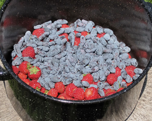 May 14 - Blossom time! Indigo Gem and Aurora in full swing, and late variety Beast even has started. Beauty and Blizzard began two days later. I was surprised at the close overlap of the varieties, all having flowers at various stages for several weeks. Even small BerryBlue and BlueMoon had a few (which I nipped out since they are too small to fruit). I'm so thankful that these bushes and blooms are very hardy so even if it should frost (which, not surprising, it did, two nights each the following two weeks) we're fairly assured of a good fruit year. It probably would be worth it to cover them this year to keep the birds from harvesting most. But it also would be a hassle so I haven't done it yet. My hope is to have enough fruit for all. Continue to work toward taller single "trunks" on all the bushes in order to cage against voles in winter. They would rather be bushes though so it's a slow process. June 24 - First good Haskap harvest! Two cups full, mostly Indigo and Aurora, plus quite a few Blizzard and Beauty. Taste-wise could hang longer but some are dropping and birds are enjoying them, too. More ripening on bushes. Old North Sea strawberries are also ripe so some good mixed sauce. I waffle back and forth about covering. HoneyBee - Winter hardware cage only 10"^ to fit under bottom branch. Vole ate more than half around stem right above cage. Cut down to two good buds at base. Two shoots grew. I decided to take one off to give all the energy into one strong stem. Later high wind event broke that one off. Grrrrr... No more sign of growth but I left the little stem with hope there is life in the roots and another sucker/shoot will grow. IndigoGem and Aurora- Mid May bushes full of open blossoms. Mid June nice first harvest about 1 cup each. Bushes look good. A low shoot grew on Aurora, cut Oct. 24, plant pieces in 50/50 potting soil/DE. 2wks in house then into greenhouse for winter. Four pieces - two 2-buds (bottom, largest buds), and two 3-bud (top). Hope one roots to plant between HB and IG where rose was. Beauty - Light crop, same timing as above. Blizzard - Not many branches but looking good. Light crop, same timing as others. Beast - Good but low growing. Need to get taller stem so can cage against voles. Later fruiting than Beauty and Blizzard.